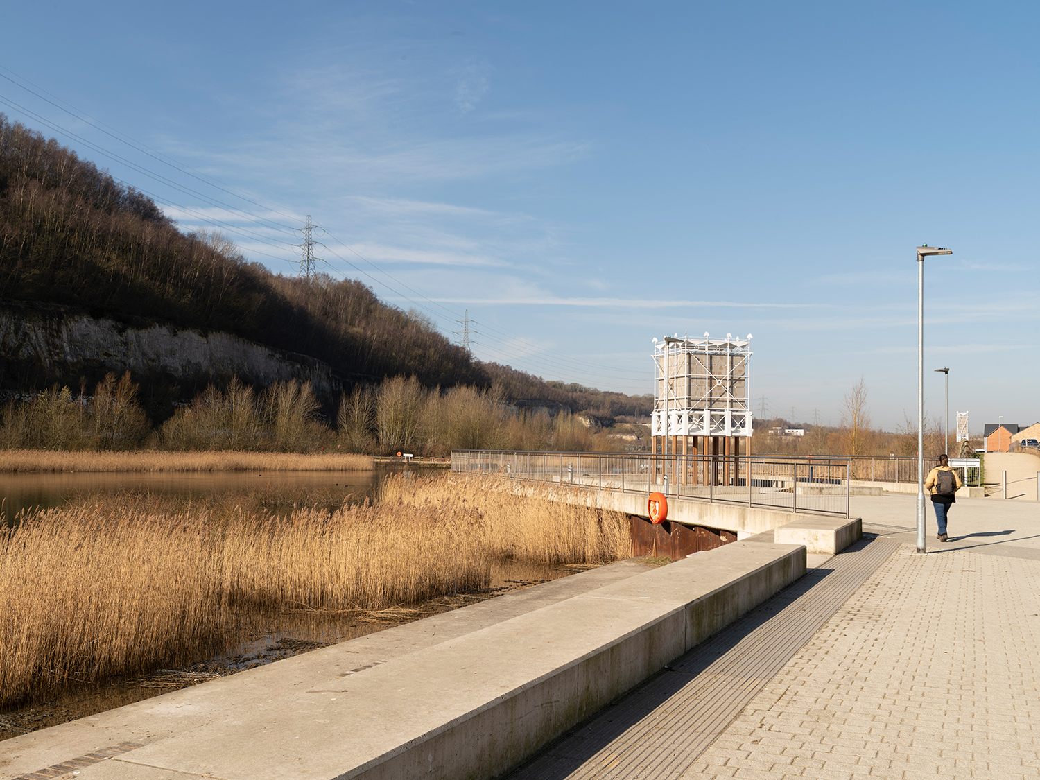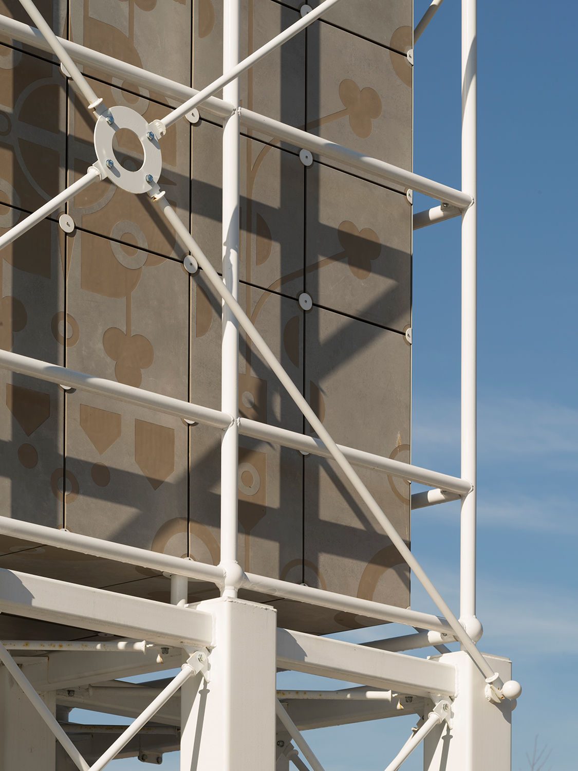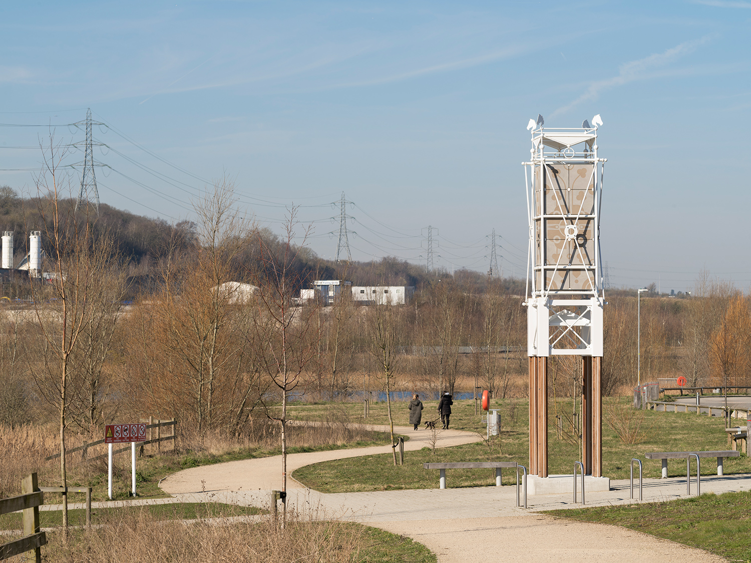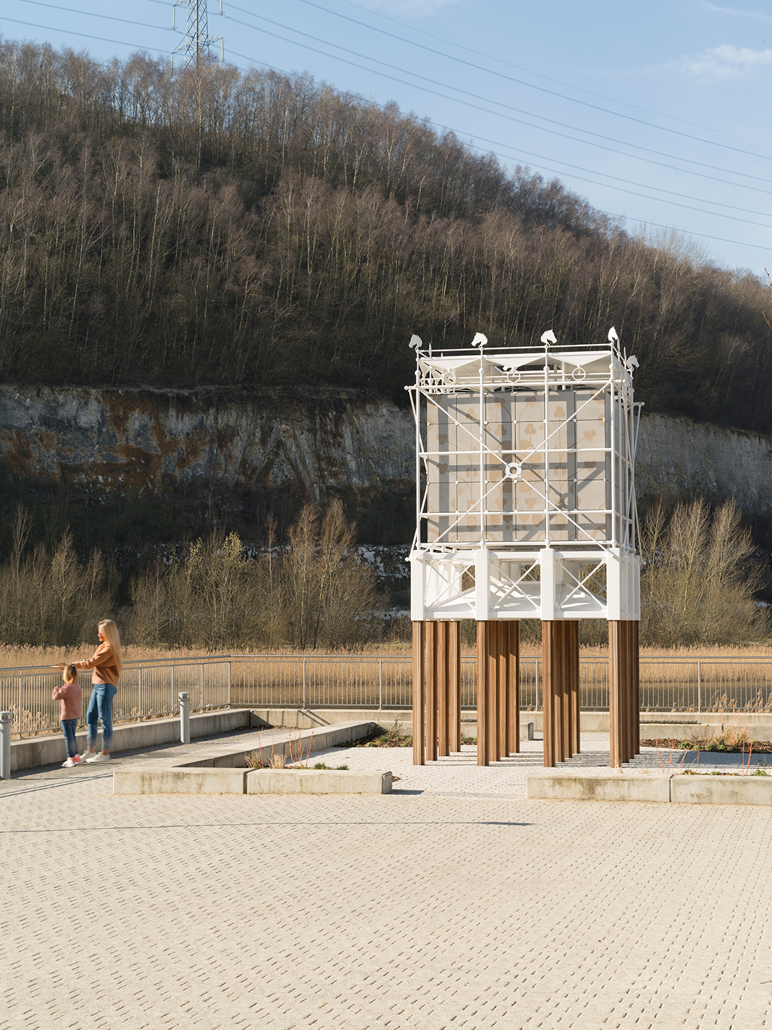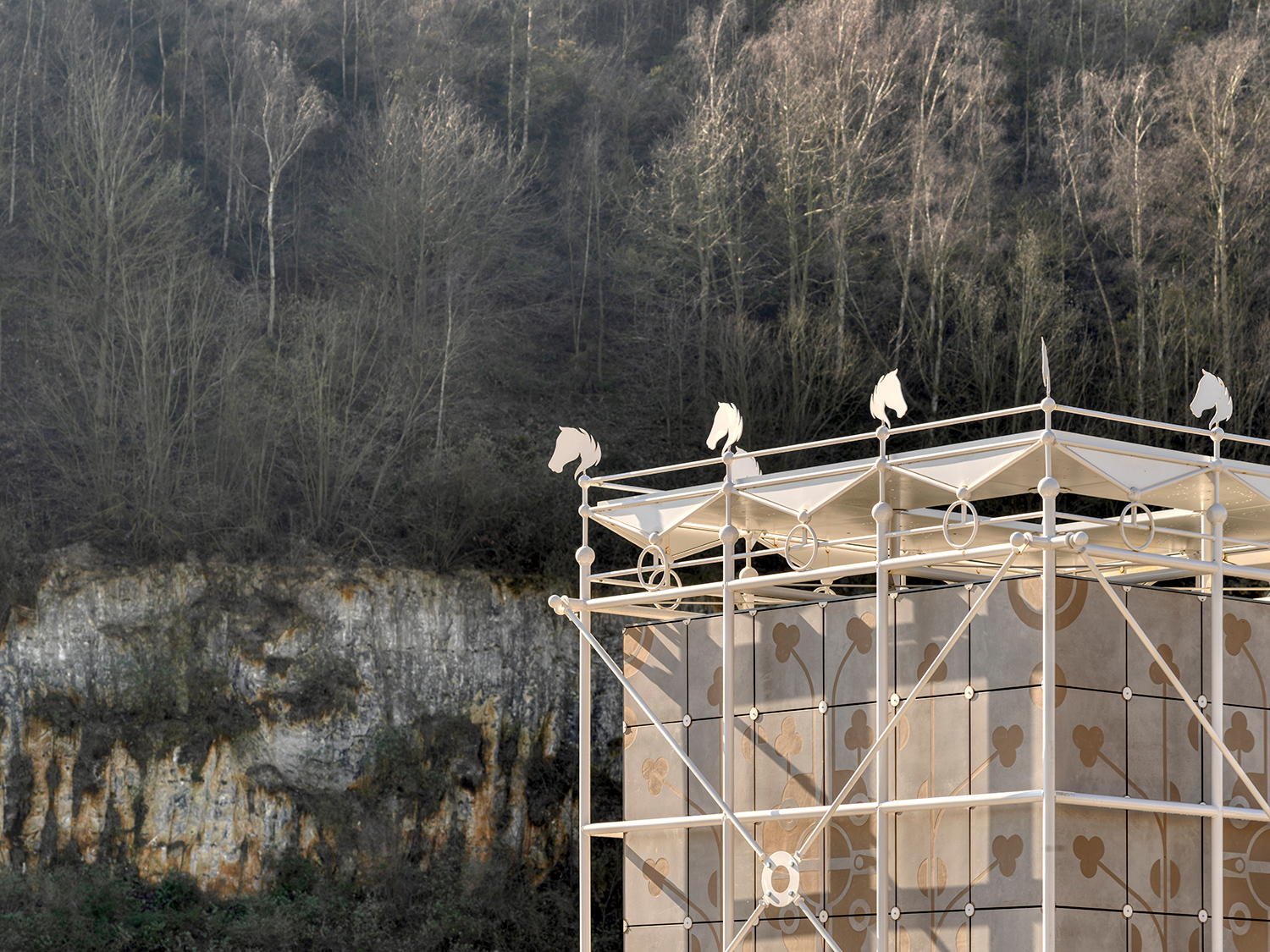 The structure comprises etched concrete tiles suspended within a white structural lattice, giving the impression of mass held lightly in place. The tiles were carefully detailed to reference the texture and weight of quarried stone, while remaining suitable for suspension within the frame. At the centre of the structure, material has been deliberately removed to form a void that frames the sky above. This carved-out centre acts as a visual and conceptual echo of a smaller folly located further up the landscape, establishing a dialogue between the two interventions across the site.