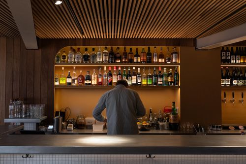 Conceived as a natural extension of Cook House, Wren provides a complementary offer of drinks and small snacks, with an interior defined by warmth, clarity of material, and a strong graphic language. Iroko cladding lines the walls, while iroko and rattan grid panels introduce rhythm, texture, and diagonal patterning - subtly referencing the modernist furniture and architectural language of Marcel Breuer. The palette draws on rich, earthy tones and colours reminiscent of the mid-1970s, creating a space that feels both familiar and quietly distinctive.